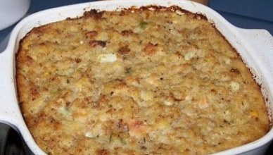 1. Розігрійте духовку до 175°C (350°F) та змастіть форму розміром 7×11 дюймів. 2. Покладіть розкришений кукурудзяний хліб у миску. 3. Розтопіть масло на