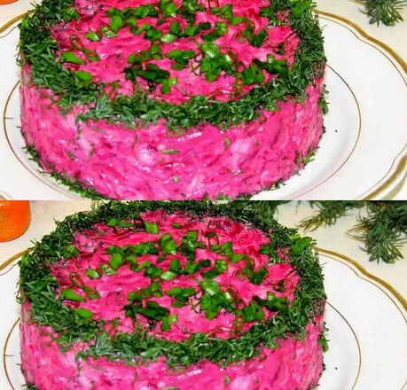 Акуратно знімаю форму. Нарізаю зелень – кріп і зелену цибульку. Прикрашаю зеленню і салат, готовий! Виходить ніжний, ароматний і неймовірно смачний. Такий салат — справжня окраса столу. Мої домашні завжди його з’їдають до останньої ложки!