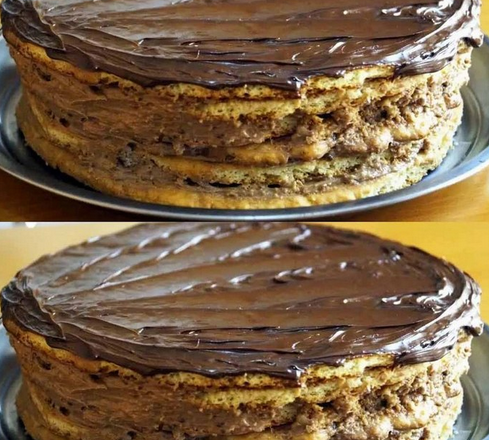 Збираю тортик, змащую усі коржики кремом. Прикрашаю розтопленим шоколадом, смачного!