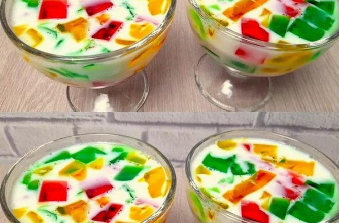Яскраві шматочки желе, залиті ніжною молочною масою, виглядають ефектно, а смак
