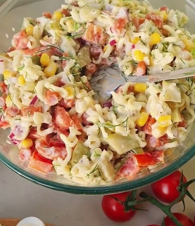 Рецепт простого, але дуже апетитного та смачного салату з шинкою або копченою ковбасою, свіжими овочами та зеленню. Просто спробуйте зробити на вечерю.