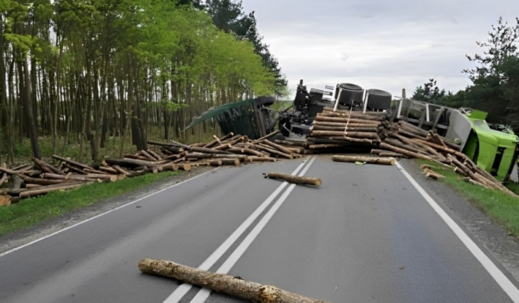 Аварія поблизу Грудзьондзу. Вантажівка, яка перевозила дерево, перекинулася та опинилася поперек дороги.