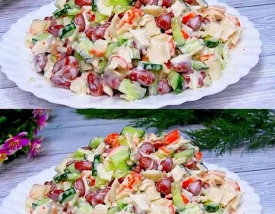 Огірок, крабові палички нарізаю кубиками. Всипаю квасолю, часник натираю на терці.