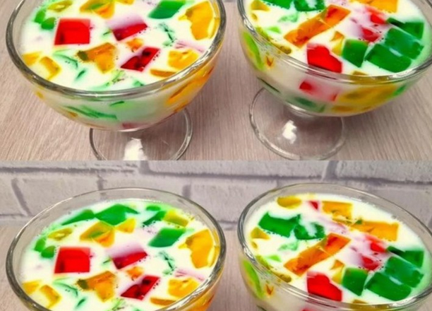 Яскраві шматочки желе, залиті ніжною молочною масою, виглядають ефектно, а смак
