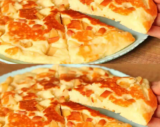 У миску вбиваю яйця, змішую гарно з цукром та сіллю. Додаю сир, олію, перемішую до однорідності. Просіюю частинами борошно і розпушувач і замішую до однорідності тіста. Беру сковорідку діаметром 26 см. Її змащую м’яким маслом, викладаю усе тісто. Яблука нарізаю кубиками, викладаю поверх тіста.