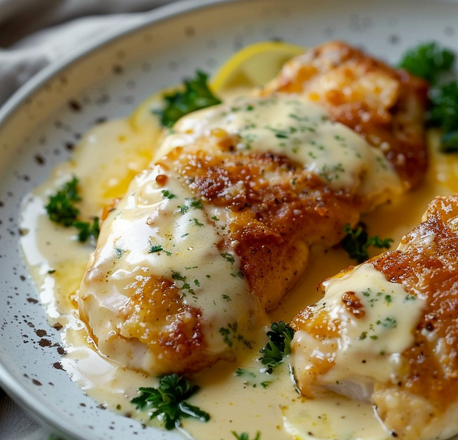 Курка в паніровці з лимоном і пекоріно з вершковим лимонним соусом