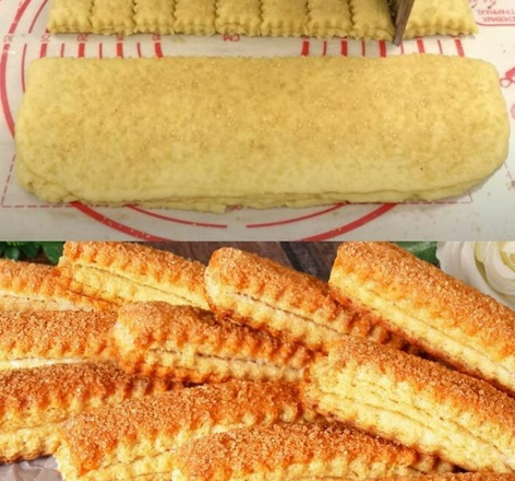Востаннє розкотіть тісто, посипте цукром і розріжте на два прямокутники .