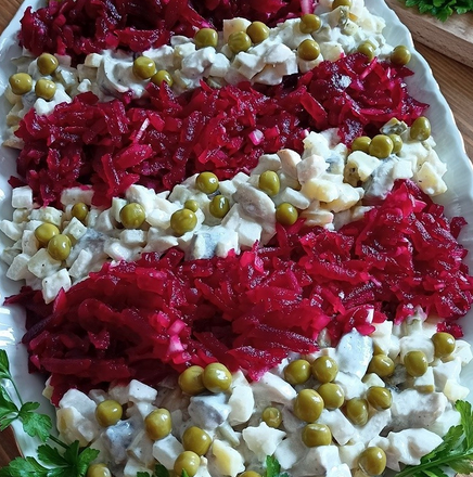 На тарілці по черзі викладіть салат з буряка та оселедця. Прикрасьте горошком, петрушкою та за бажанням грибами. Охолодіть салат у холодильнику, щоб інгредієнти поєдналися.