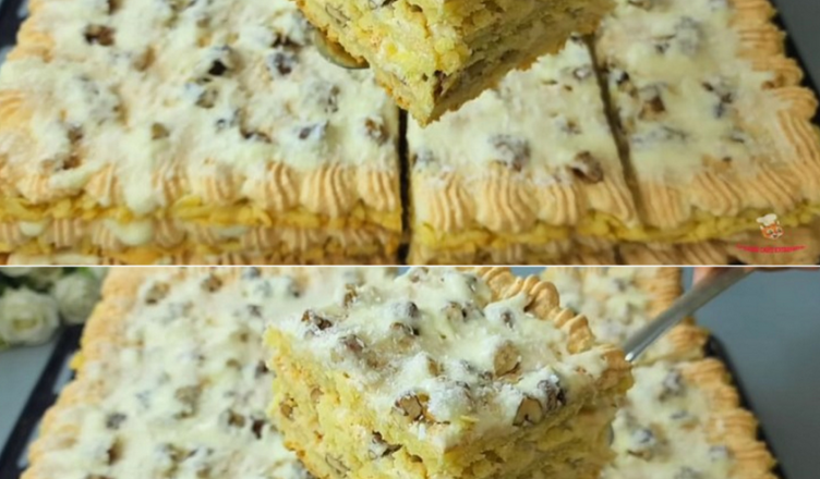На пергаментний папір натираємо охолоджене тісто на великій тертці й рівномірно розподіляємо його. - Викладаємо збиті білки (крем) поверх тіста, формуючи гарний шар. Посипаємо волоськими горіхами.