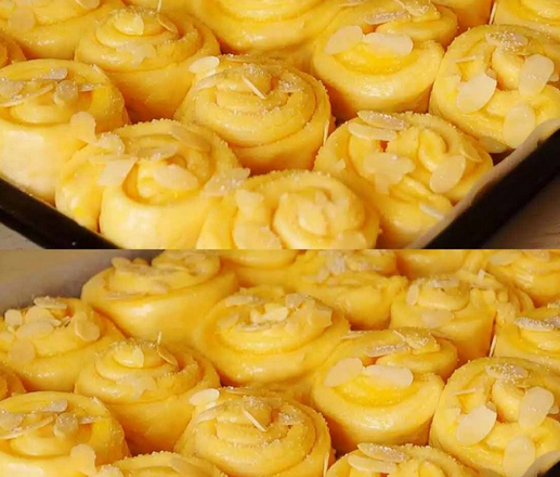 Викладаю щільно на форму 30 на 22 см для випікання застелену пергаментом. Накриваю харчовою плівкою та залишаю на 20 хвилин. Змащую збитим яйцем. Посипаю мигдальними пелюстками та ванільним цукром.