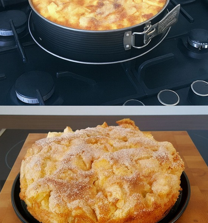 . Ось як це працює: Спочатку замісіть тісто з маргарину або вершкового масла, цукру, яєць, розпушувача та борошна. Наріжте яблука великими шматочками (наприклад, на восьмі частини, залежно від розміру яблук) та змішайте їх з тістом. Перекладіть все у змащену маслом рознімну форму та трохи розрівняйте (хоча це легше сказати, ніж зробити).2. Тепер випікайте в розігрітій духовці за температури 180°C на нижній полиці приблизно 1 годину. Через 45 хвилин рясно змастіть маслом і щедро посипте цукром або сумішшю цукру та кориці.