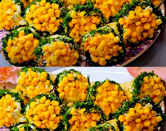 Викладіть салат у готові кошички з лаваша. Прикрасьте зеленню зернами кукурудзи зверху.
