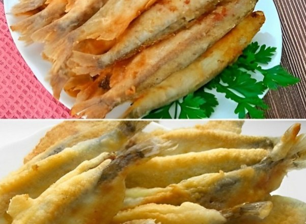Смаження: Смажте рибу у великій кількості олії (не менше півсклянки). Обвалюйте рибок у борошні, потім у яйці і знову в борошні. Обсмажуйте з двох боків до золотистої скоринки.