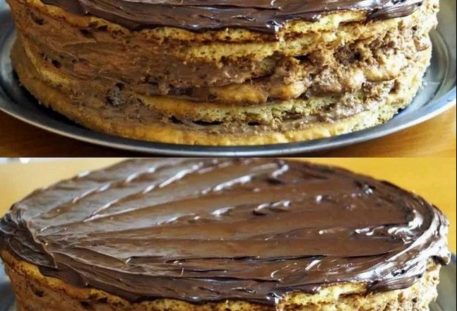 Збираю тортик, змащую усі коржики кремом. Прикрашаю розтопленим шоколадом, смачного!