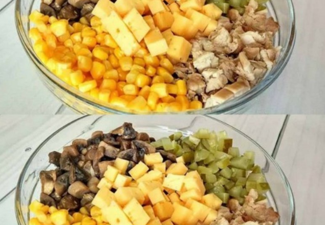 Відварене м’ясо, твердий сир та мариновані огірки нарізаю квадратиками. Всипаю консервовану кукурудзу.