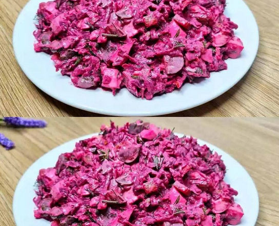 Салат виходить дуже апетитний, ніжний і трохи пікантний завдяки часнику. Розкладаю його по тарілочках, прикрашаю гілочкою кропу — і запрошую всіх до столу.