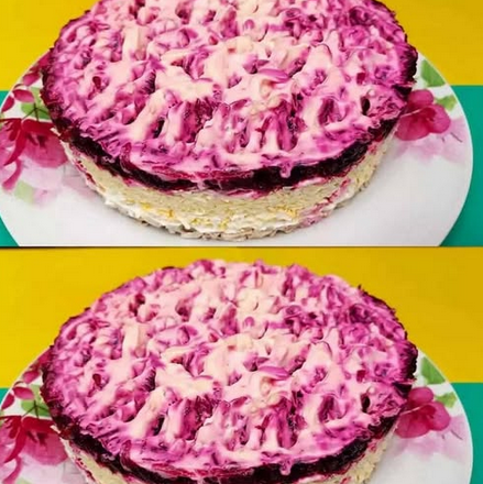 Натираю на терці варений буряк Змішую в окремій мисці видавлений часник з майонезом. Покриваю салат, смачного!
