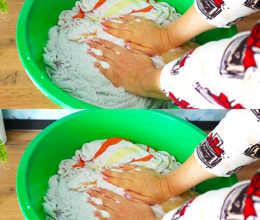 Склала рушники та поклала їх у таз. Залила гарячою водою, щоб вони наситилися, але не плавали. Далі взяла господарське мило 72%. Добре натерла рушники з двох боків. При натисканні їх виходить піна.