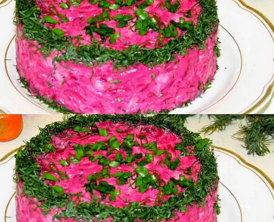 Акуратно знімаю форму. Нарізаю зелень – кріп і зелену цибульку. Прикрашаю зеленню і салат, готовий! Виходить ніжний, ароматний і неймовірно смачний. Такий салат — справжня окраса столу. Мої домашні завжди його з’їдають до останньої ложки!