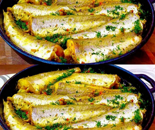 Минуло кілька хвилин, овочі пустили сік. Викладаю маринованого хека прямо на овочеву подушку. Рештки маринаду обов’язково виливаю поверх. І ще раз змащую хека. Накриваю кришкою і тушу на найменшому вогні 30–35 хвилин. Води не додаю – овочі та хек дають свій сік, і цього цілком достатньо.