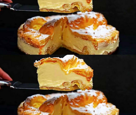Перед подачею присипаю торт цукровою пудрою. Нарізаю порційними шматочками — вони виходять м’які, ніжні, крем буквально тане в роті. Цей торт дуже простий у приготуванні, а смак просто неймовірний. М’яке заварне тісто та ніжний крем роблять його схожим на великий еклер, тільки ще смачніший!