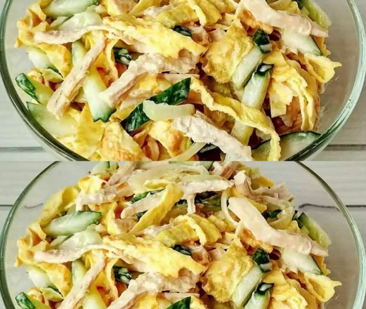Нарізаю тонкими брусками свіжий огірок. Викладаю огірки та яєчну соломку у салатник. Відварену курячу грудку ділю на волокна. Нарізаю півкільцями цибулю, обсмажую в олії на сковороді до золотистості. Додаю цибулю, заправляю салат майонезом і перемішую.