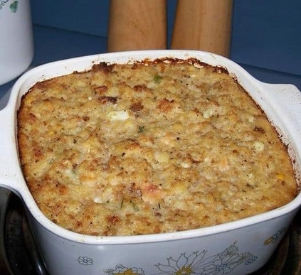 Розтопіть масло на сковороді на середньому вогні. 4 Обсмажте цибулю та селеру до розм’якшення (5–7 хв). 5 Додайте до кукурудзяного хліба. 6. Змішайте курячий бульйон, яйця, шавлію, сіль,