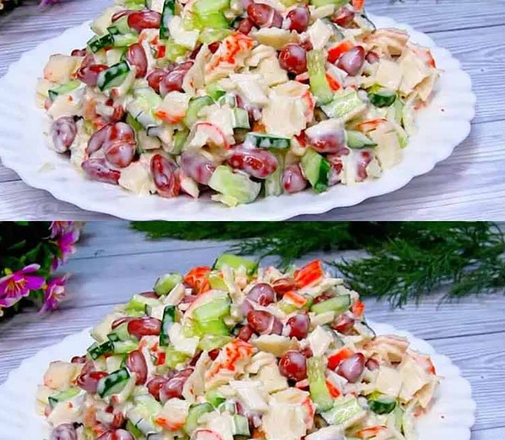 Огірок, крабові палички нарізаю кубиками. Всипаю квасолю, часник натираю на терці.