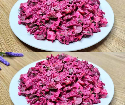 Салат виходить дуже апетитний, ніжний і трохи пікантний завдяки часнику. Розкладаю його по тарілочках, прикрашаю гілочкою кропу — і запрошую всіх до столу.