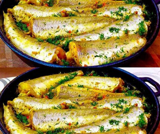 Минуло кілька хвилин, овочі пустили сік. Викладаю маринованого хека прямо на овочеву подушку. Рештки маринаду обов’язково виливаю поверх. І ще раз змащую хека. Накриваю кришкою і тушу на найменшому вогні 30–35 хвилин. Води не додаю – овочі та хек дають свій сік, і цього цілком достатньо.