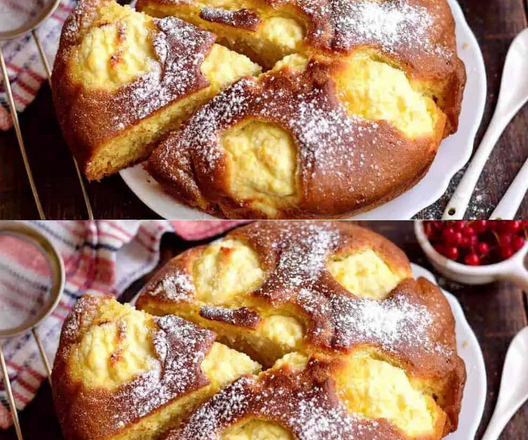 Пиріг виходить дуже пишними, тісто м’яке, трохи вологе, а солодкий сир просто ідеально вписується в ніжну випічку.