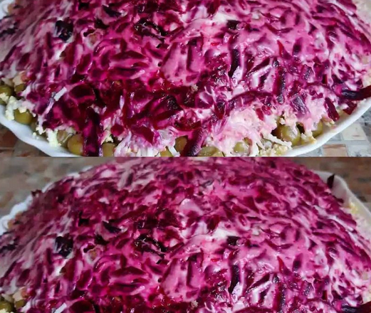 Останній шар — буряк. Беру варений буряк, натираю на терці й розподіляємо зверху. Змащую майонезом, щоб завершити салат. Залишаю його настоятися в холодильнику пару годин — тоді смак розкриється повністю, і можна подавати на стіл.