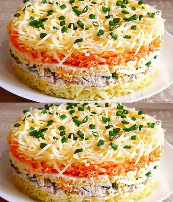 Далі на наступний шар нарізаю дрібно зелену цибулю. Тоді натираю на терці яйця та покриваю майонезом. Моркву натираю на терці і змішую в окремій мисці з майонезом та видавленим часником. Викладаю далі у форму, розрівнюю.