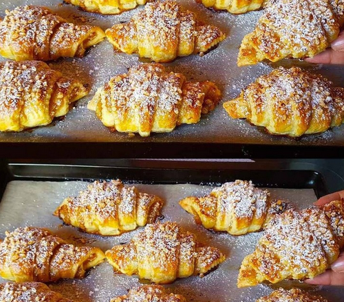 Беру один пласт листкового тіста, кладу на пергамент, змащую молоком, зверху кладу другий пласт, посипаю борошном та розкачую трішки зверху два пласти. Розрізаю на трикутники. Викладаю охолоджену яблучну начинку, розмащую, зверху розмащую варення. Посипаю подрібненим мигдалем. Закручую рогаликами.