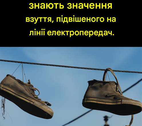 Пара старих кросівок, чобіт або шльопанців, що висять на лінії електропередач — повільно гойдаються на вітрі, немов дивні міські прикраси.
