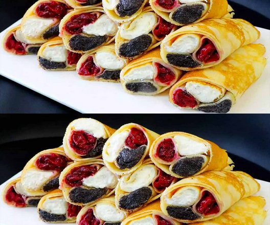 Беру один млинець, з одного боку викладаю сирну начинку, а з іншого – вишневу. Скручую дві начинки до середини млинця.