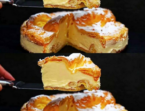 Перед подачею присипаю торт цукровою пудрою. Нарізаю порційними шматочками — вони виходять м’які, ніжні, крем буквально тане в роті. Цей торт дуже простий у приготуванні, а смак просто неймовірний. М’яке заварне тісто та ніжний крем роблять його схожим на великий еклер, тільки ще смачніший!