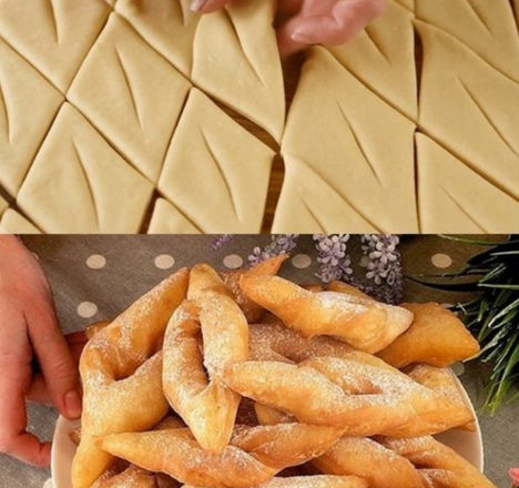 • Наріжте тісто на прямокутники та зробіть проріз у центрі кожного прямокутника. Протягніть один край тіста через проріз, щоб отримати класичну форму хмизу.