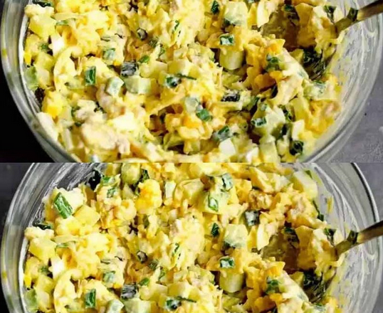 Твердий сир натираю на тертці. Зелену цибулю дрібно нарізаю, додаю мариновану цибулю без рідини, заправляю салат майонезом, сіллю та перцем, перемішую.
