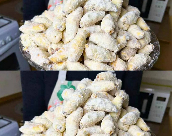 Готові ще гарячі рогалики обсипаю цукровою пудрою, змішаною з трішки ваніліном. Ванілін беру мало, щоб пудра не була гіркувата. Обсипаю руками, поки рогалики теплі — так пудра краще прилипне.  Смак — неперевершений, а аромат — просто казка!