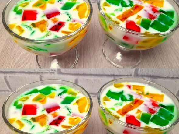 Яскраві шматочки желе, залиті ніжною молочною масою, виглядають ефектно, а смак