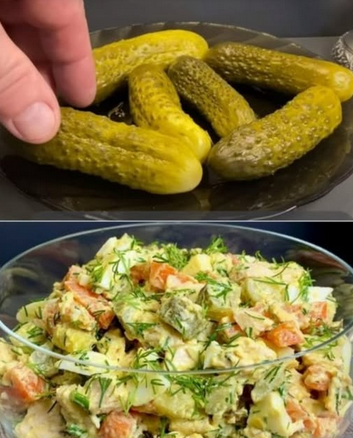 1. Мариновані огірки – дрібно наріжте та викладіть у велику миску.