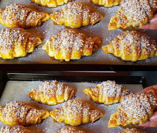 Беру один пласт листкового тіста, кладу на пергамент, змащую молоком, зверху кладу другий пласт, посипаю борошном та розкачую трішки зверху два пласти. Розрізаю на трикутники. Викладаю охолоджену яблучну начинку, розмащую, зверху розмащую варення. Посипаю подрібненим мигдалем. Закручую рогаликами.