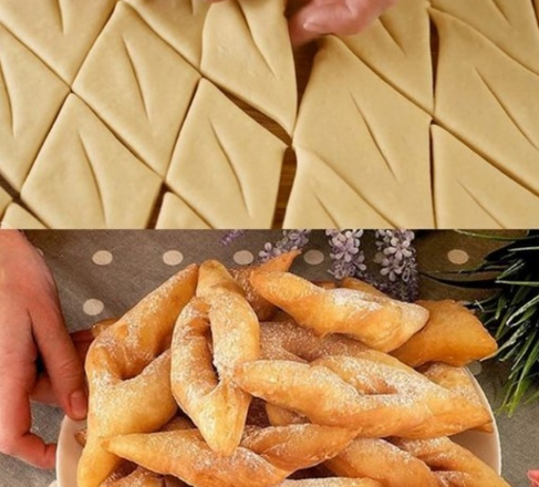 • Наріжте тісто на прямокутники та зробіть проріз у центрі кожного прямокутника. Протягніть один край тіста через проріз, щоб отримати класичну форму хмизу.