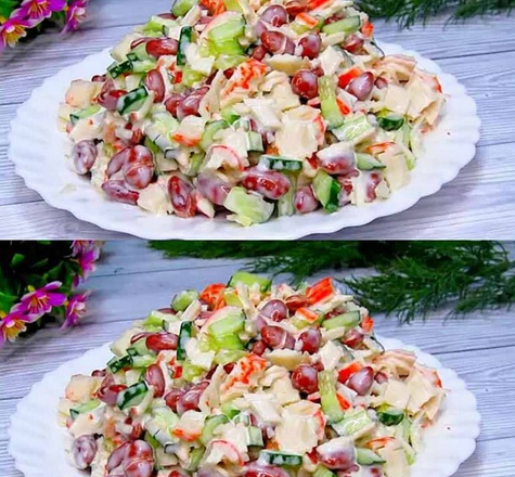 Огірок, крабові палички нарізаю кубиками. Всипаю квасолю, часник натираю на терці.
