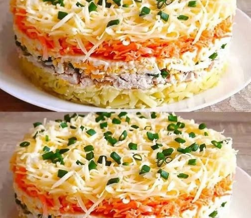 Далі на наступний шар нарізаю дрібно зелену цибулю. Тоді натираю на терці яйця та покриваю майонезом. Моркву натираю на терці і змішую в окремій мисці з майонезом та видавленим часником. Викладаю далі у форму, розрівнюю.