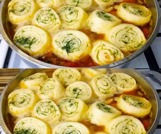 Рулети викладаю у суп, каструлю накриваю кришкою і варю на невеликому вогні 7-10 хвилин. Смачного!
