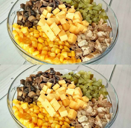 Відварене м’ясо, твердий сир та мариновані огірки нарізаю квадратиками. Всипаю консервовану кукурудзу.