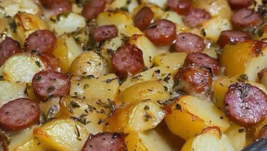 Ця запечена копчена ковбаса з картоплею – простий і смачний спосіб приготувати ситну та ароматну страву з мінімальними зусиллями. Поєднання пікантної копченої ковбаси,