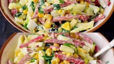 Приготую дуже смачний салат з кукурудзою та ковбасою! Салат готую із простих продуктів, які завжди є у холодильнику у кожної господині! Інгредієнти: Приготування: